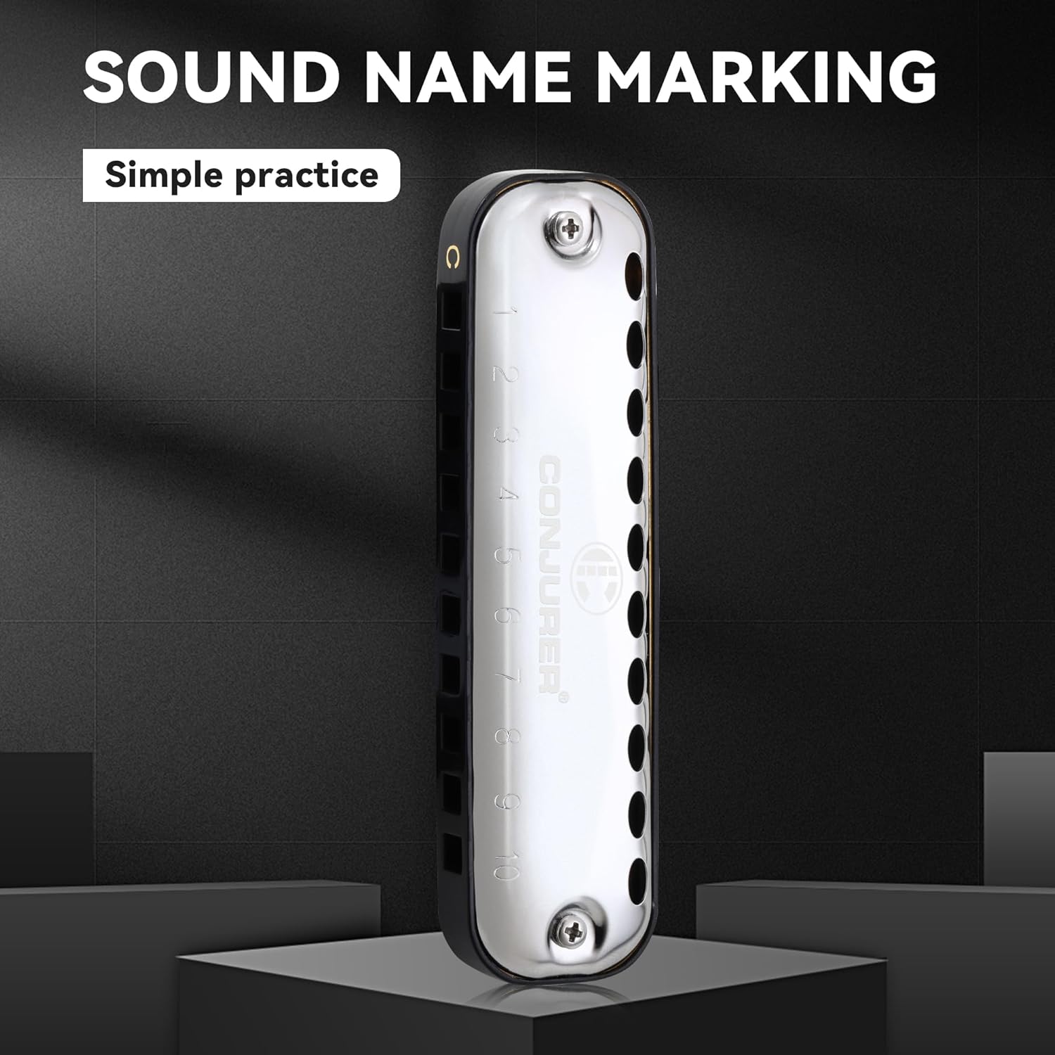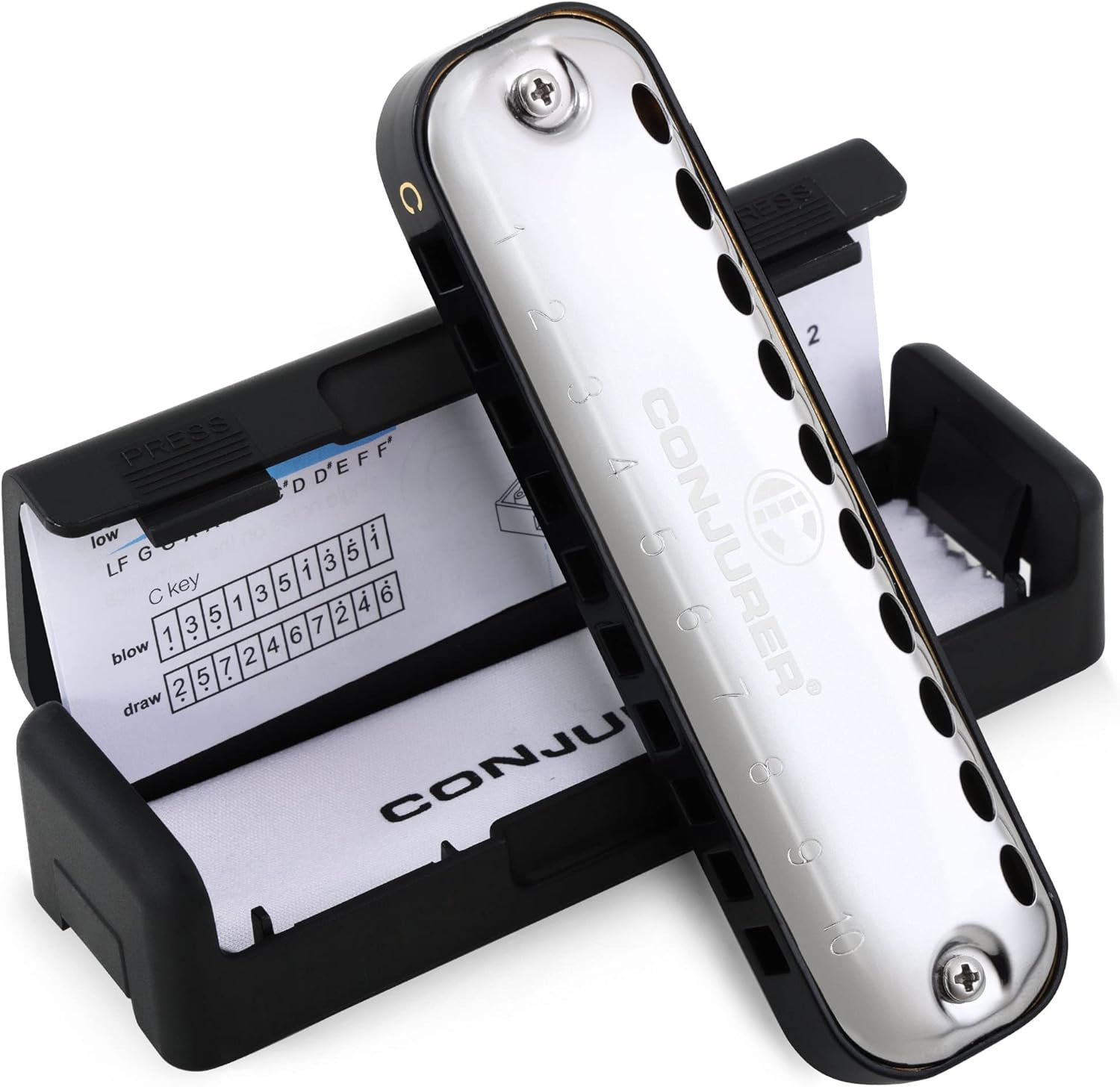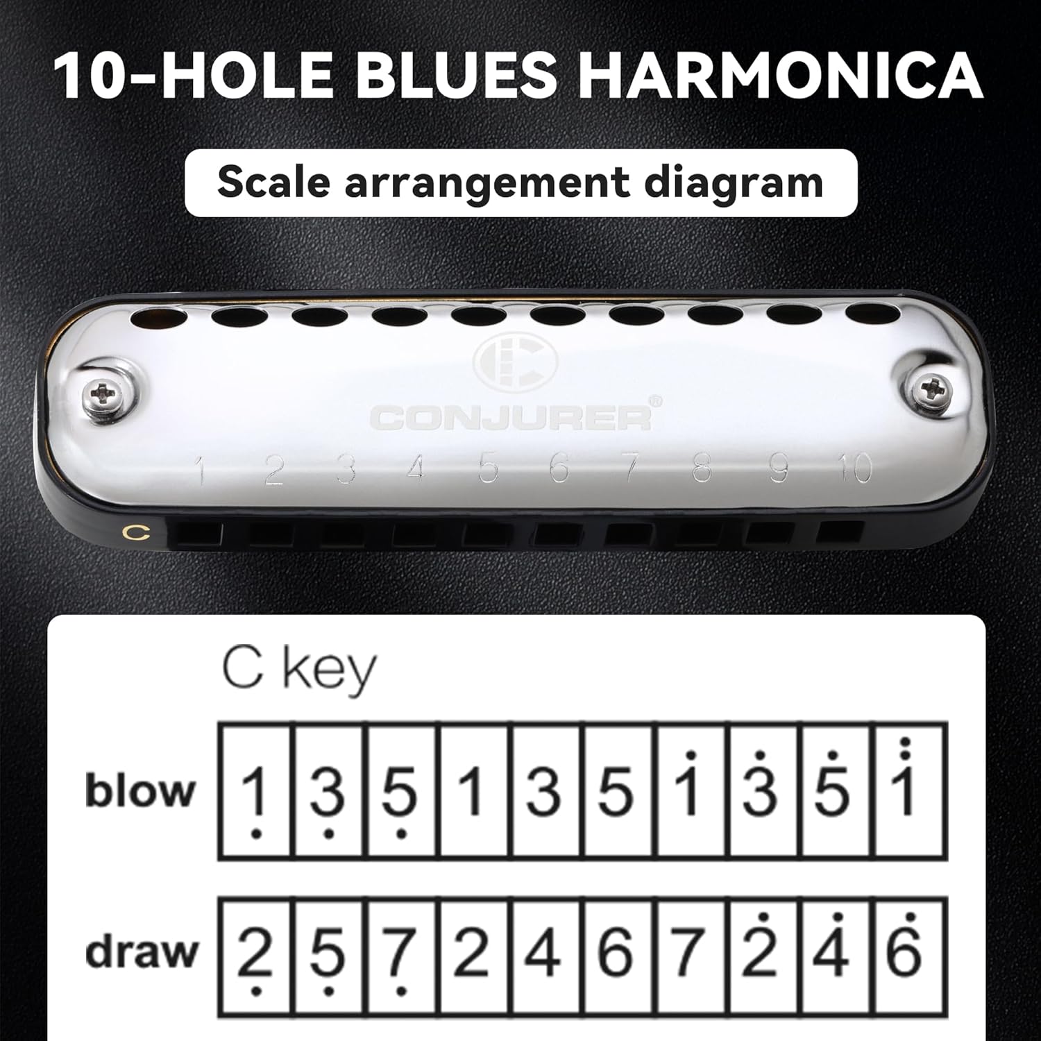 CONJURER Blues Harmonica for Kids Adult Beginners 10 Hole Diatonic Harmonica Key of C, Brass Reed Metal Mouth Organ C Key Blues Harp with Case, Black
