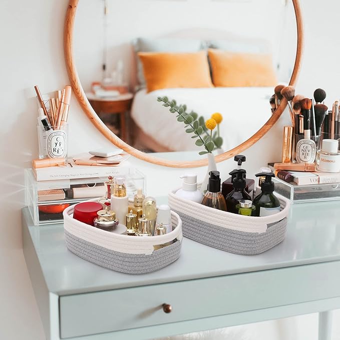 7 Piece Cotton Rope Woven Basket Set - Small Basket for Baby Nursery, Pets, Montessori, Dog & Cat Toy Boxes, Bathroom Organization Bins (White/Gray)