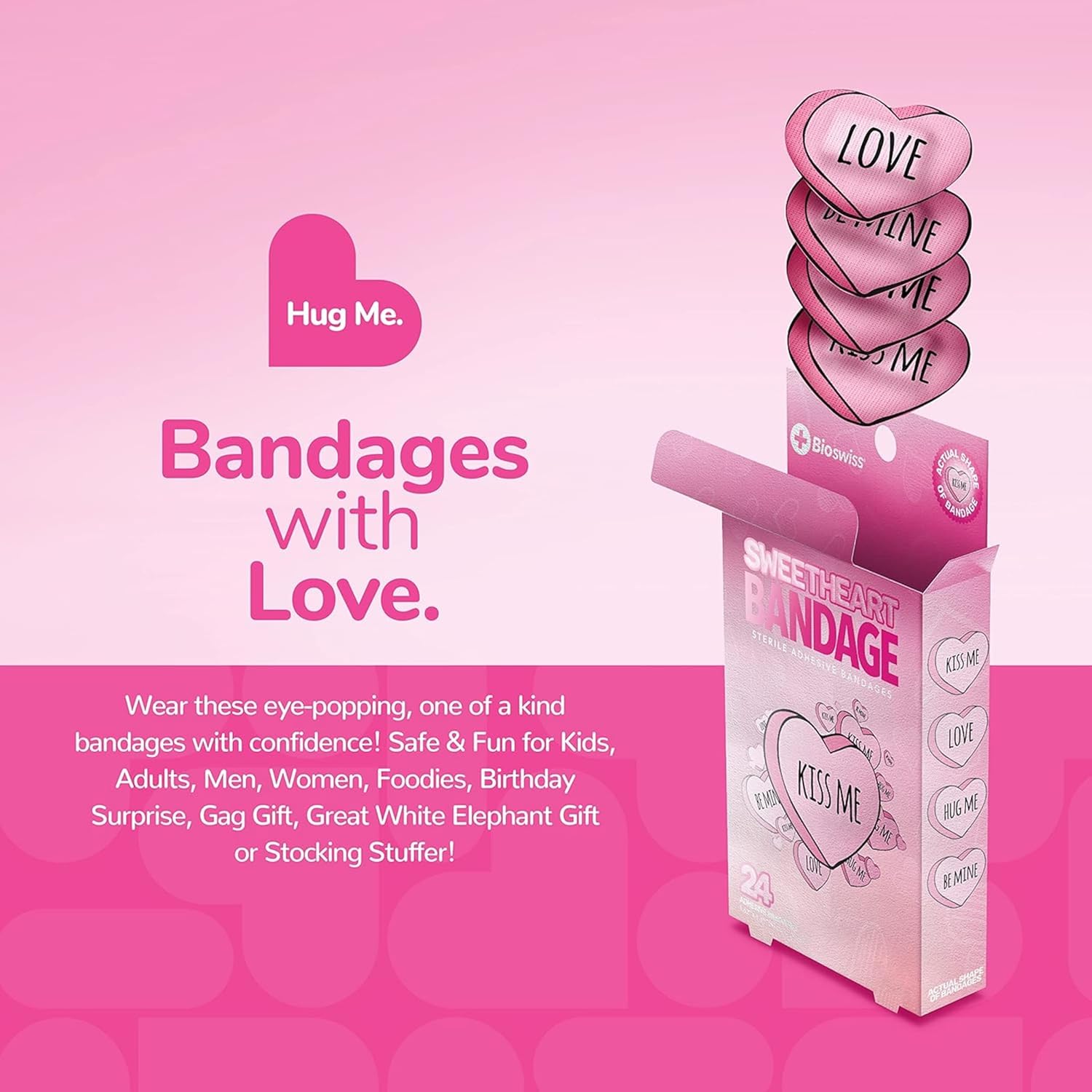 - VALENTINE HEART BANDAGES: This 24 piece pack of funny Valentine heart "Kiss Me" bandages is great for putting a smile on kids' faces while protecting wounds such as cuts, scrapes, and burns, and come in 4 assorted styles; sticky bandages are perfect for kids and adults alike, and also for school nurses and pediatric doctors