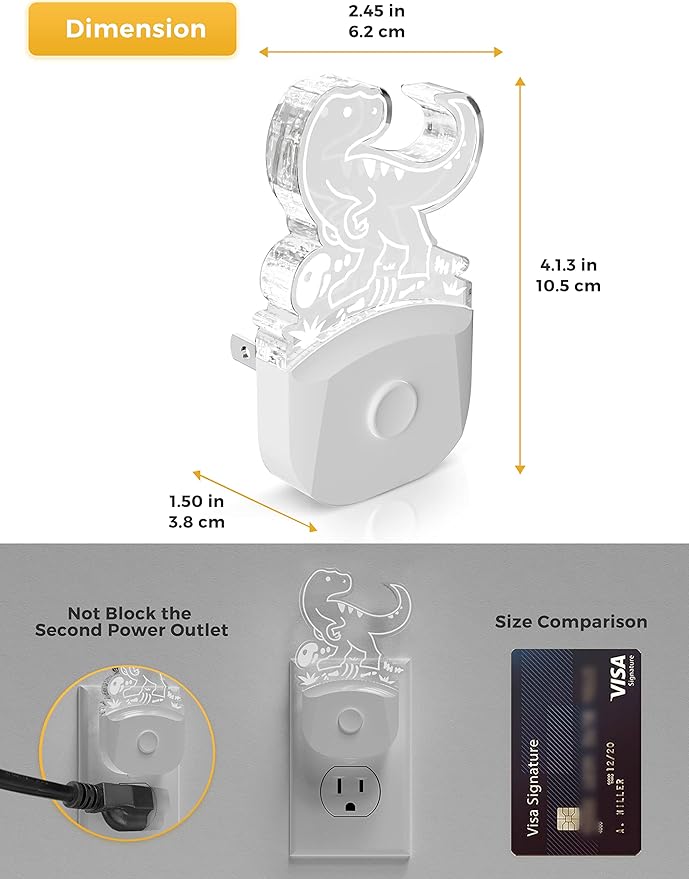 - Dusk to Dawn Sensor: This dinosaur velociraptor plug in night light has a built-in light sensor. When the surrounding light is dark enough when the night light will open, when the light becomes bright night light will automatically turn off.