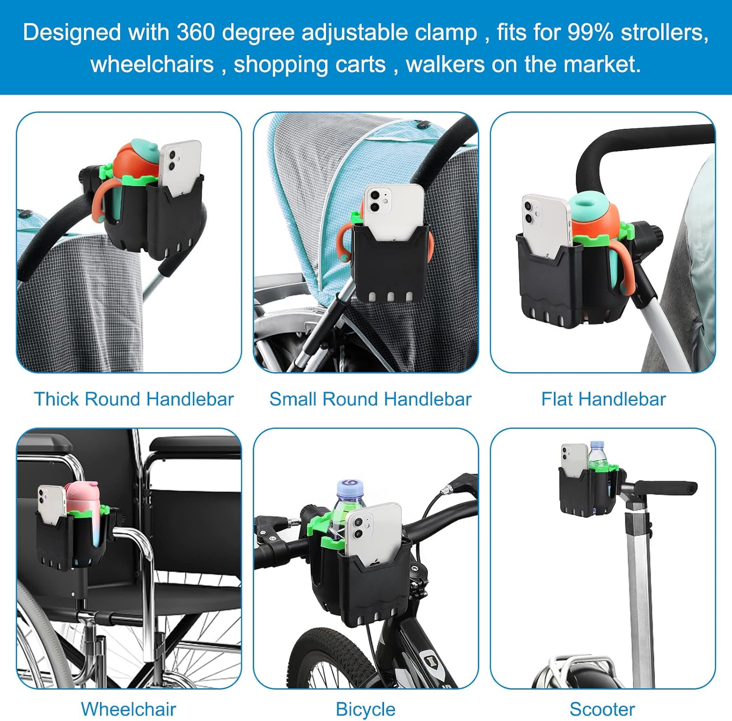 - This stroller cup holder with a phone holder, it can load drink bottles and mobile phones at the same time. You can see new messages, incoming calls in the first time. It fits for most mobile phones.