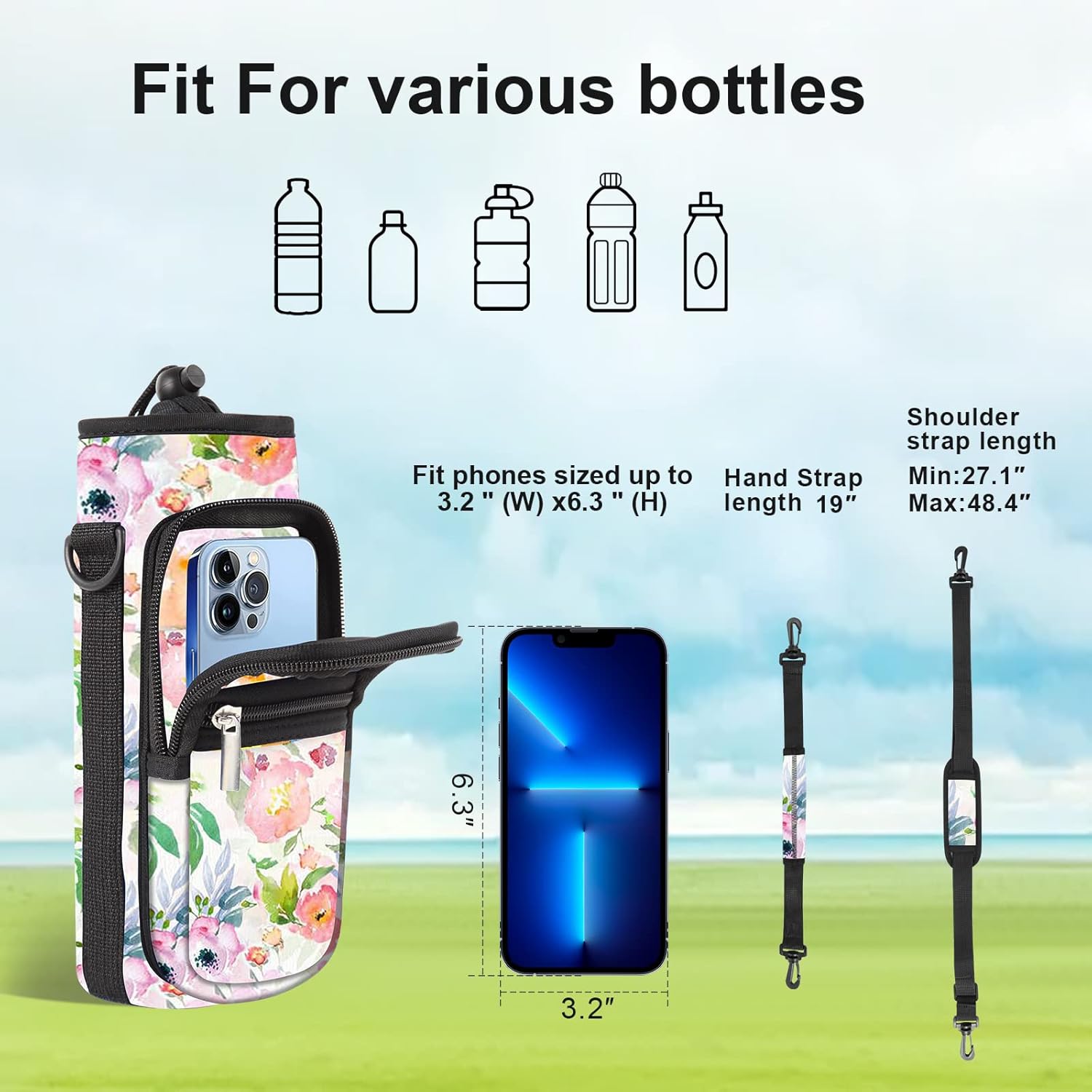 • 【Size】: Our AORTDES water bottle crossbody bag has 4 sizes to choose. 25oz (Max Bottle Diameter 8.2cm ≈ 3.23", Height 23cm ≈ 9.05", Pockets Size 7.48" x 3.93" x 1.57"). 32oz (Max Bottle Diameter 9.7cm ≈ 3.82", Height 20cm ≈ 7.87", Pockets Size 7.48" x 3.93" x 1.57"). 40oz (Max Bottle Diameter 9.7cm ≈ 3.82", Height 23cm ≈ 9.05", Pockets Size 7.48" x 3.93" x 1.57"). 64oz (Max Bottle Diameter 13cm ≈ 5.12", Height 23cm ≈ 9.05", Pockets Size 7.48" x 3.93" x 1.57").