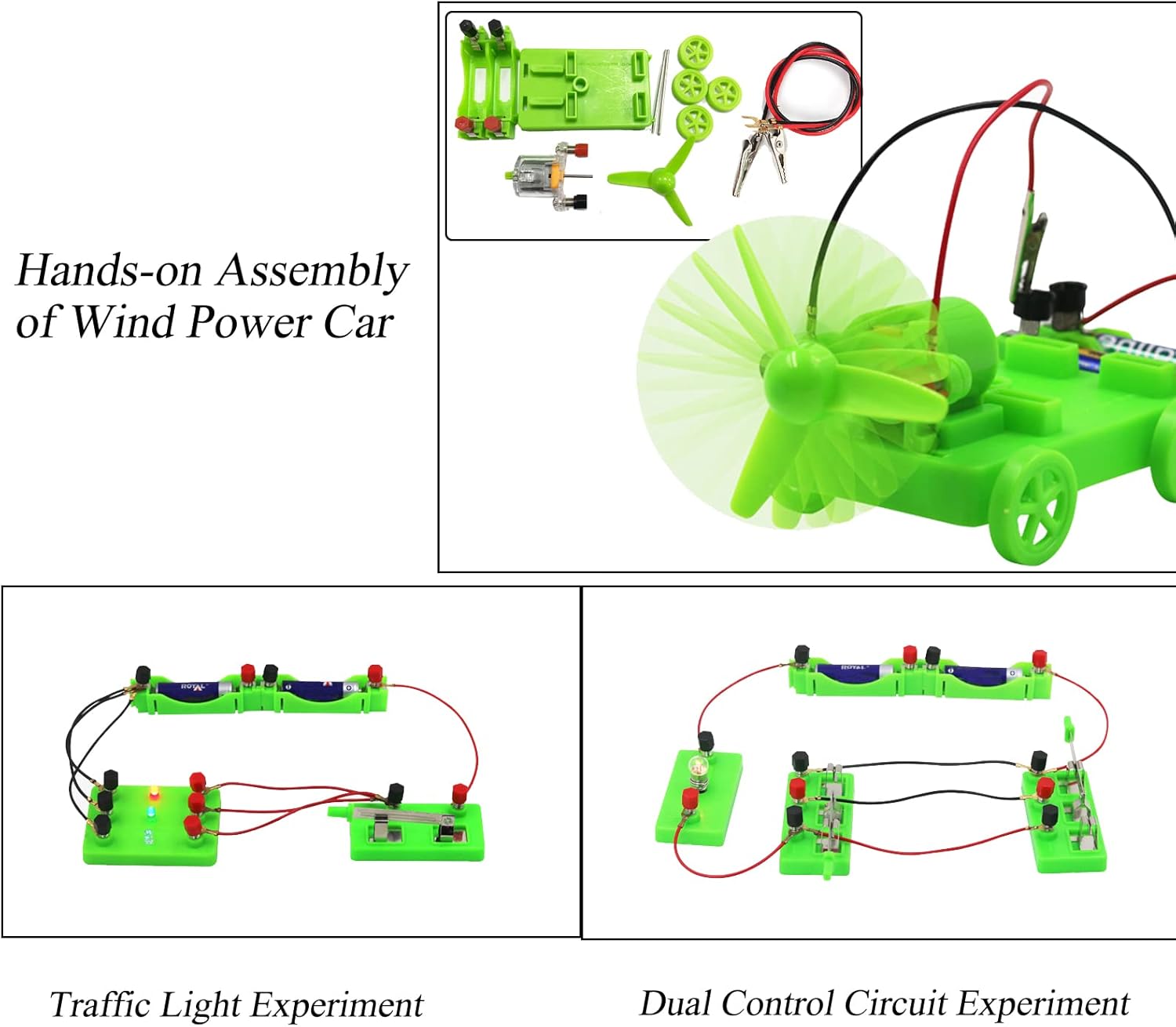 - 【Hands-on Learning】- Traffic Light Experiment: The basic electricity kit for kids adopts newly designed LED board, with three colors of lights: red, green and colorful light, which can better demonstrate the control of lighting by circuit. Hand-cranked Generator Experiment: Using the principle of power conversion, electric energy converts wind power to generate thrust, which is interesting and educational.