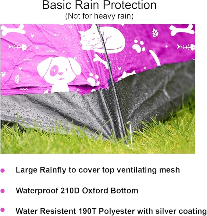 - Kids Tents with Basic Rain Protection (Not for heavy rain): This outdoor tent has basic rain protection functions but not for heavy rain. It is equipped with large rainfly to cover the top. The fabric is 190T Polyester with silver coating to be water resistant, and the bottom is 210D waterproof Oxford.