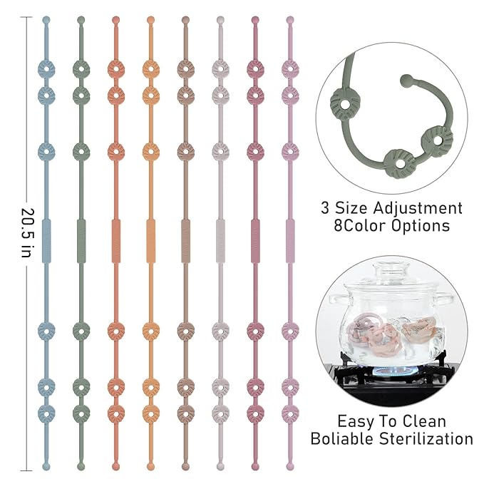 - 【Adjustable And Reusable】 The stretchable baby toy tether straps with multiple grommets, freely adjustable length, and are easy to use. Toy leashes can also be washable and boiled to reuse, keep clean, and safety.