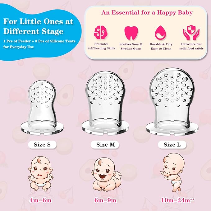 - 【TRY SOLID FOOD FLAVORS】HAOBAOBEI silicone feeder set including 2 pack baby silicone feeder with 4 silicone pouches, which is designed to fit for each age. Just put fresh fruits, food or frozen breastmilk, your baby will enjoy the taste of solid foods by chew the baby feeder.