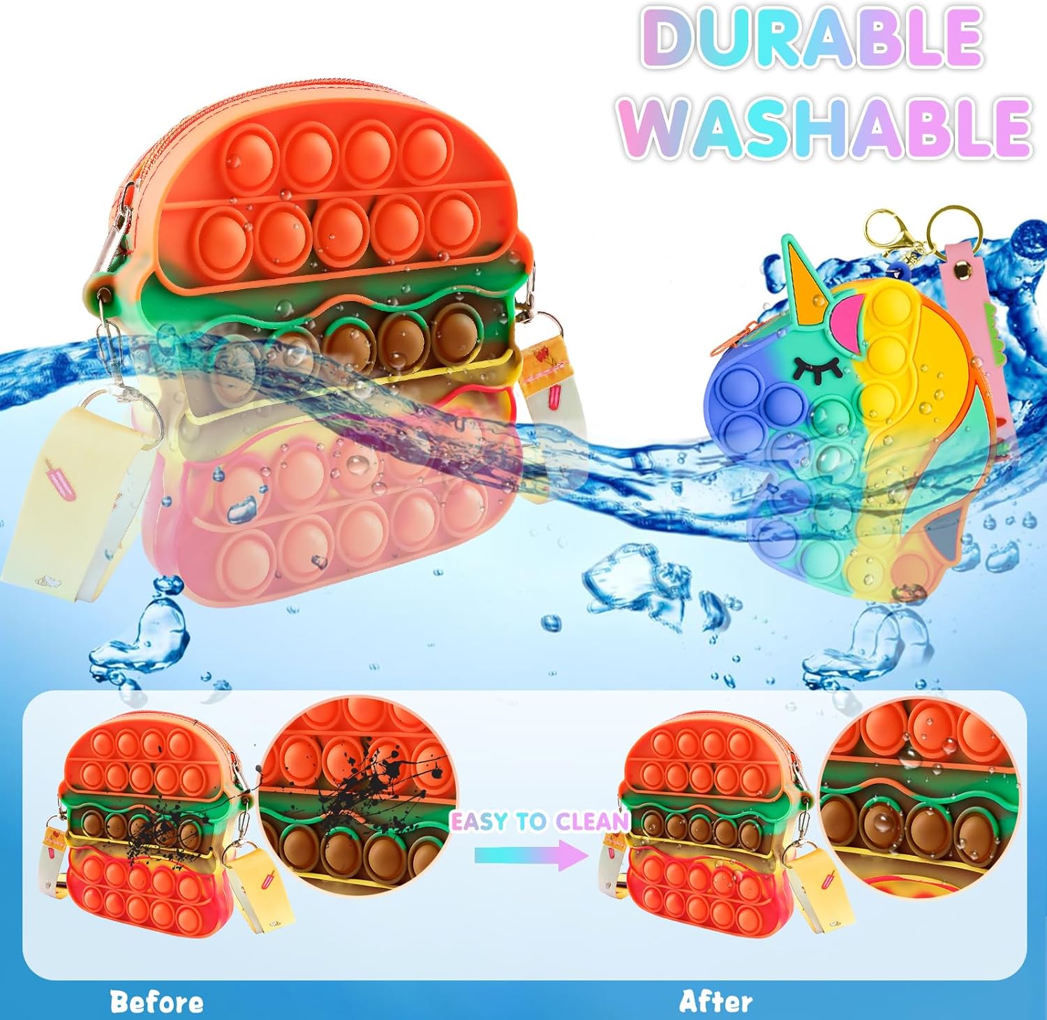 - PREMIUM MATERIAL: This new push bubble toy is made of high-grade silicone material that is safe and no harmful substance for kids. Sensory toys can be washed and reused. Our toys meet the printing standard, which is not fade after washing.