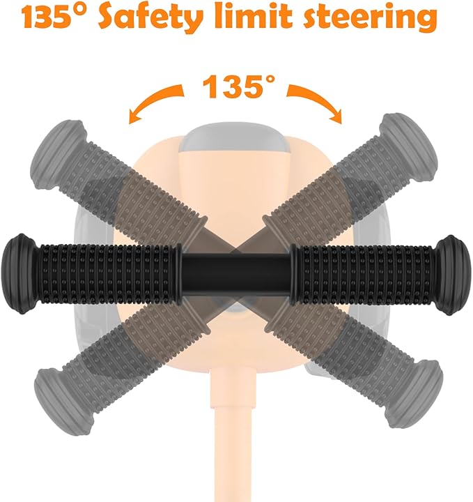 - đ¨ă135° SAFTY STEERINGăHandlebar rotation is limited to 135° to avoid side falling caused by excessive turning amplitude. The special front wheel design allows the bike body to sway slightly from side to side when turning.