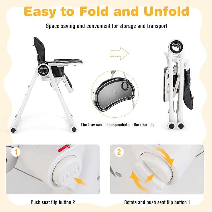 - Folding Design & Easy Mobility: The infants feeding chair is easy to fold and unfold in seconds, saving space for storage and transport. Besides, the food trays can be suspended on the rear leg, which avoids wasting time to find or store the food trays. Moreover, the portable feeding chair is built with 4 wheels and all wheel are lockable for firm standing.