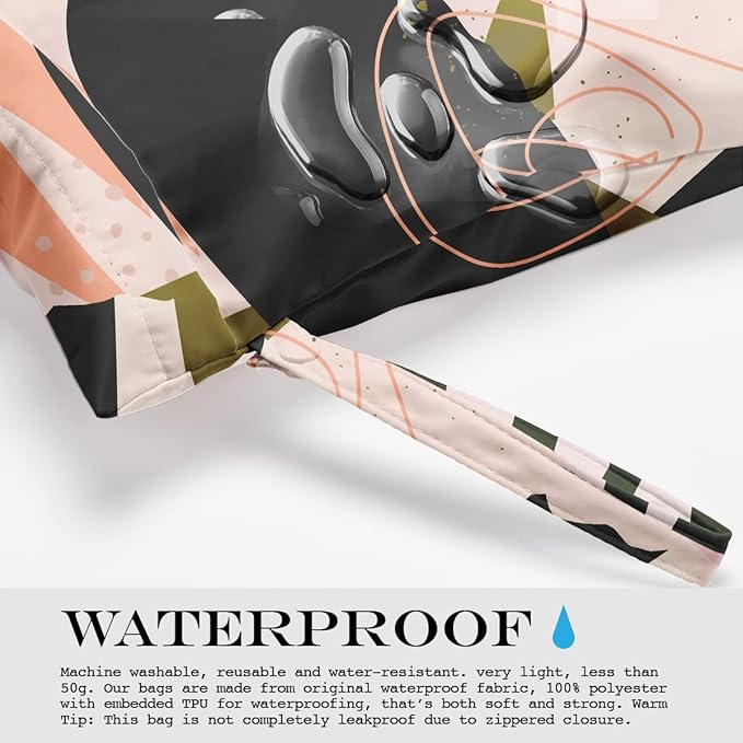 - WATERPROOF - Machine washable, reusable and water-resistant. very light, less than 50g. Our bags are made from original waterproof fabric, 100% polyester with embedded TPU for waterproofing, that’s both soft and strong. Warm Tip: This bag is not completely leakproof due to zippered closure.