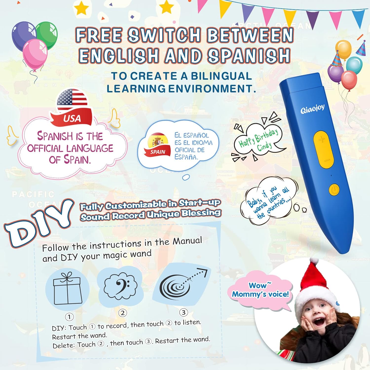 - 【Bilingual World Map & DIY Magic Wand】- Educational talking world map great for children studying in both English and Spanish. The stylus is applicable in all Qiaojoy products; Supporting personalized start-up sound; Supporting recording: kids can use recording function to tell stories, sing songs etc. Imaginatively and interactively design kids own creative world!