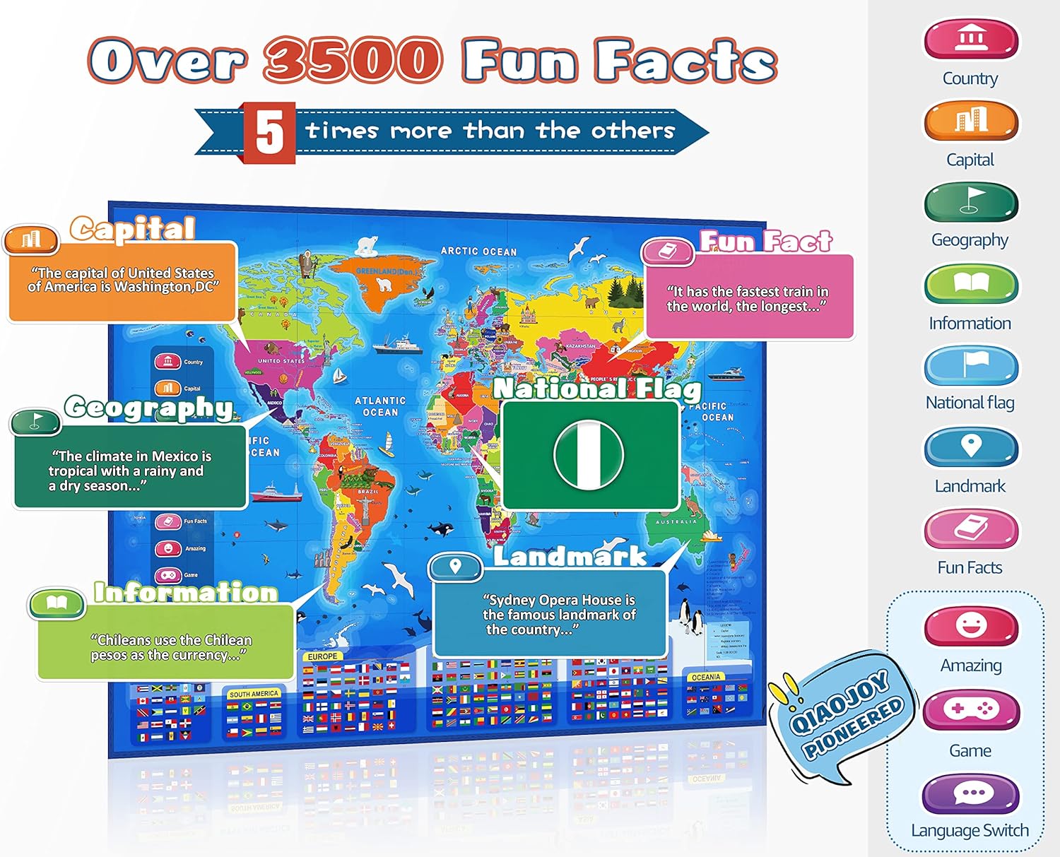 - 【Encyclopedic Learning】- The interactive world map helps kids learn 3500 fun facts about 195 countries all around the world! Help children to explore world and learn countries knowledge, flag, capital city, population, language, animal, ocean and so on.