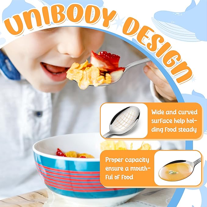 - 【MATURE APPERANCE】Special streamlined pattern can easily grasp children’s interest, They will be excited to use the silverware like parents’ and try feeding themselves with their own cutlery, Highly developing their independence and cultivating kids’ good habit