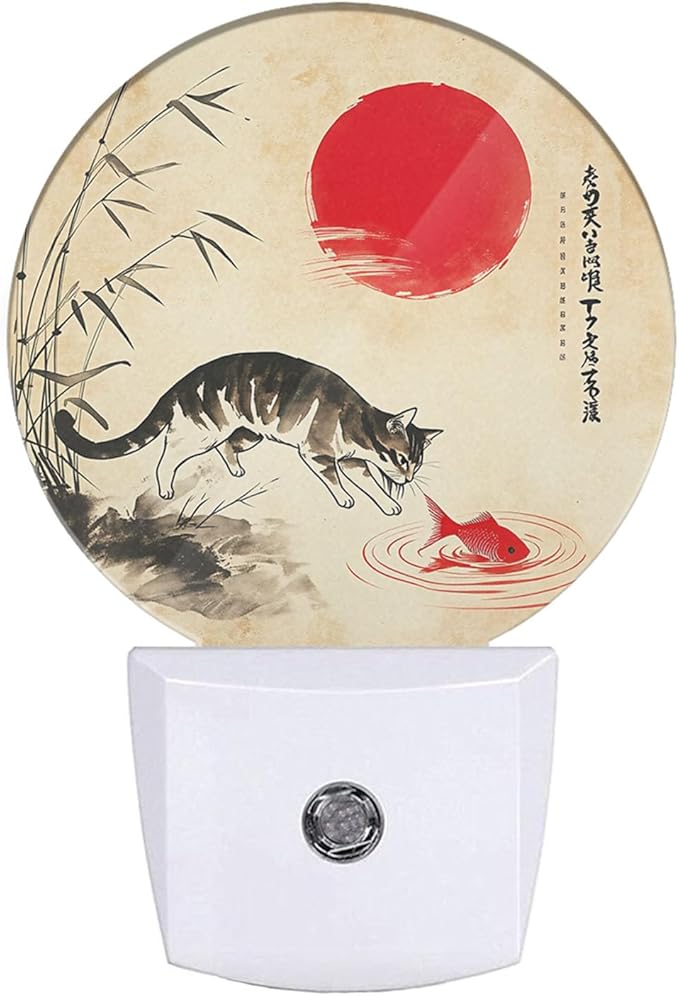 EKOBLA Fish in Pond LED Night Light Red Sun Bamboo Branch Cute Cat Play with Fish Dusk to Dawn Plug-in Nightlights Auto Sensor for Home Indoor Bathroom Hallway Kitchen