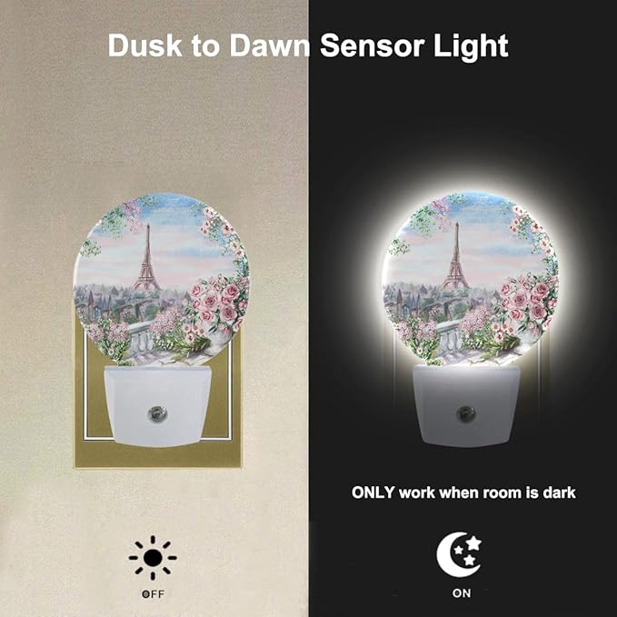 EKOBLA Watercolor Eiffel Tower Night Light Rose Flowers on The Balcony France Paris Landmark Plug-in Nightlights Auto Sensor Plug-in LED Wall Light for Home Bedroom Living Room