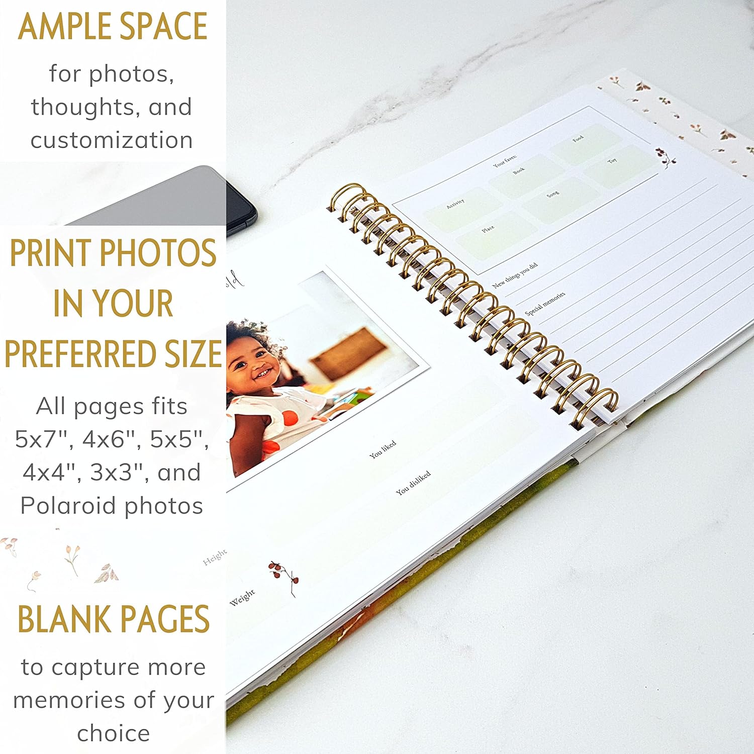 - CUSTOMIZABLE to give a personal touch: With REFLECTIVE PROMPTS, our baby scrapbook album has AMPLE SPACE FOR PHOTOS and HEARTFELT MESSAGES. This baby picture book features a FREE-SIZED PHOTO AREA ON ALL PAGES that FITS 5X7", 4X6", 4X4", OR 3X3" IMAGES, so you can print them in any size you prefer. Our newborn book's spine has expandable double spiral binding so that it LAYS FLAT for the EXCEPTIONAL EASE OF USE and REMOVAL OF PAGES and the book cover expands to retain shape as you stick photos.