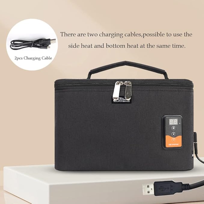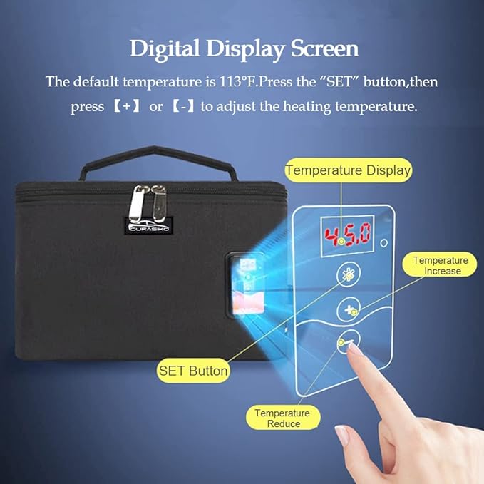 - 【Temperature Adjustment】There is a digital display screen on the warmer bag,you can see the real-time temperature clearly.You can adjust the temperature through the button 【+】and 【-】.The default temperature is 113°F,it can be adjusted up to 140°F.