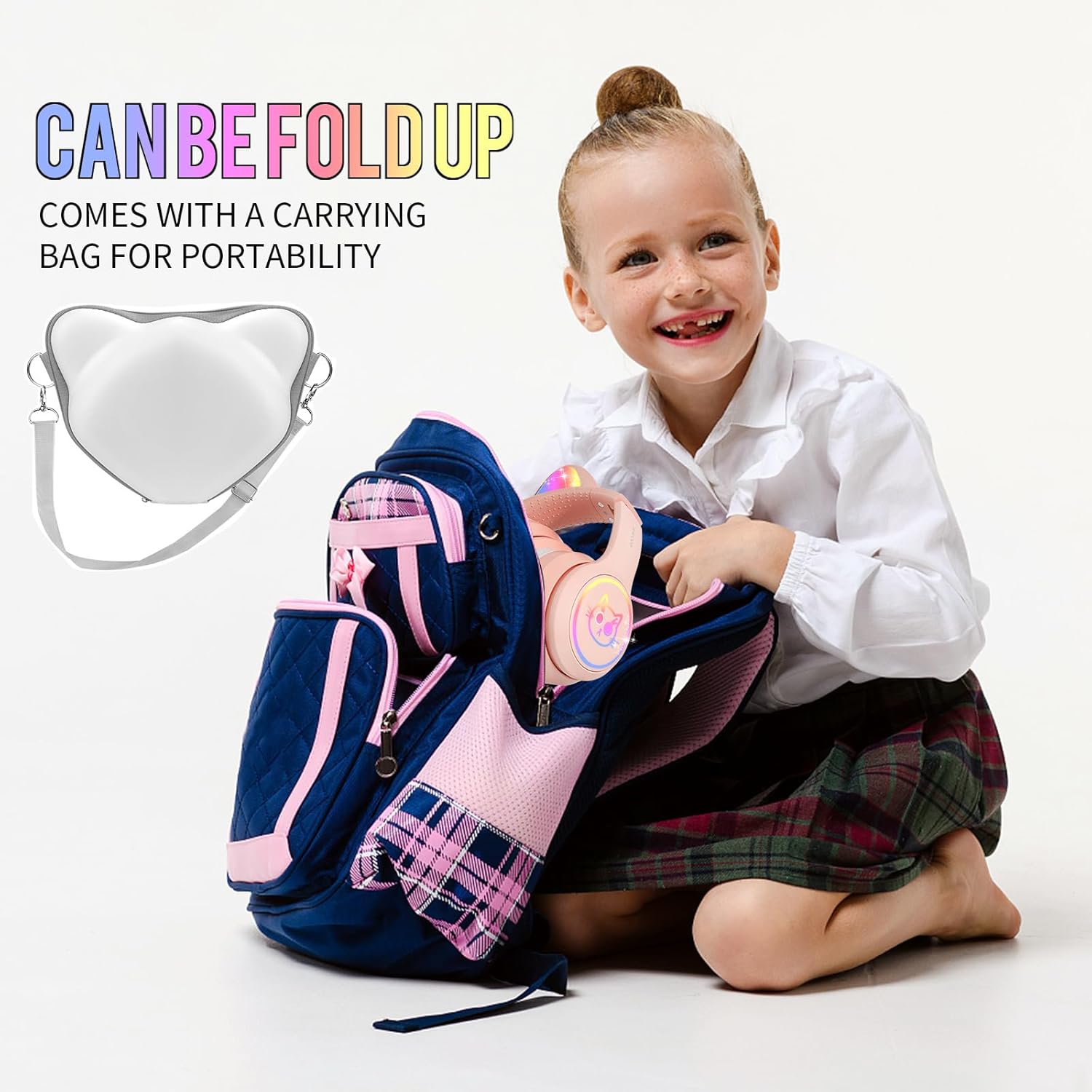 - Cute Kids Wireless Headphones with Case:the light up and flash mode make the headphones more interesting and Let your children have the ability to light up the room and shine with the rhythm of the music.We use the reinforced material to prevent these toddler headphones broken easily;A premium bag also inclued for convenient carrying out and protect the foldable headphones no matter spills, accidents, and anything else your kids throw at them;