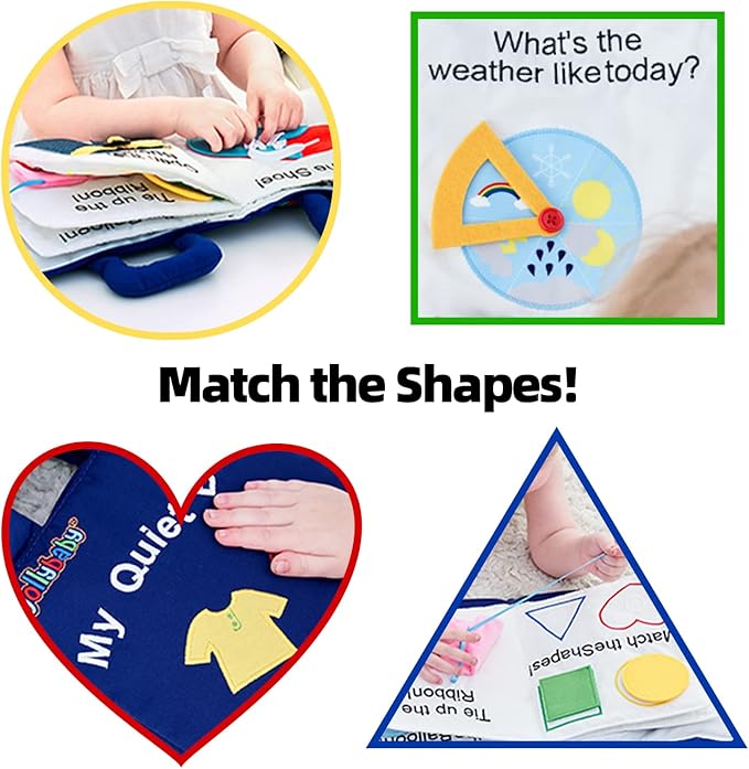 - Montessori Toys - This quiet book features with 10 learning activities,designed for toddlers 1 year old, when playing this busy board, toddlers focus on matching the velcro colored shapes, practicing the zippers and buttons, telling time etc.