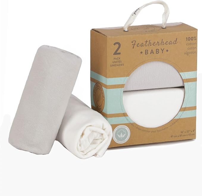Featherhead™ 2-Pack Fitted Crib Sheets - 100% Cotton - 52" x 28" x 9" for Standard Crib and Toddler Mattress (Bassinet Sheets - White/Grey)