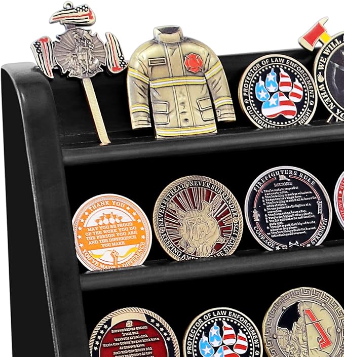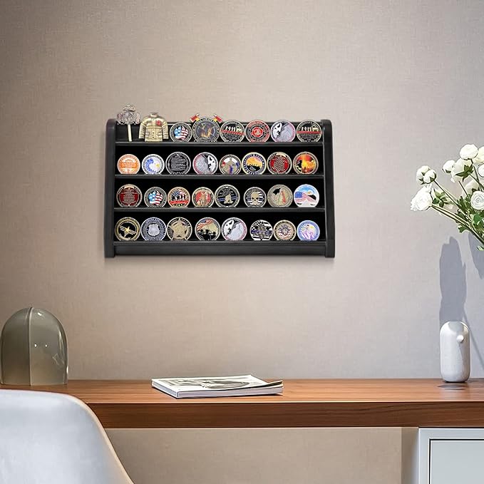 - ๐๐ฆ๐ฉ๐ฅ๐ ๐๐๐ฉ๐๐๐ข๐ญ๐ฒ: This challenge coin holder can accommodate up to 32 standard-size challenge coins. Each row has a shelf distance of about 1.75 inches and a groove width of 0.2 inches. To accommodate thicker coins, the top row groove is made 0.3 inches wide, making it a versatile coin display case