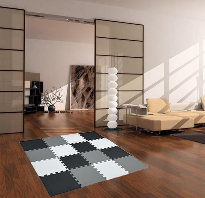 16 Pieces Foam Play Mat with Border, Interlocking Playmat Tiles, Foam Floor Mat Tiles for Kids, Puzzle Play Mats, Exercise Gym Mats – Color of Black & Grey & White