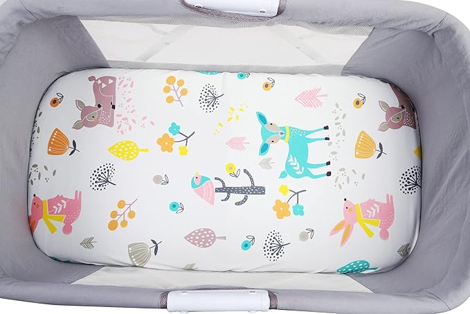 Onacosht Bassinet Sheets for Baby Boy and Girl, Stretchy Fitted Sheet Universal for Bassinet Cradle Hourglass Oval Rectangle Pad/Mattress, 4 Pack Deer, Elephant, Rabbit and Squirrel Printing