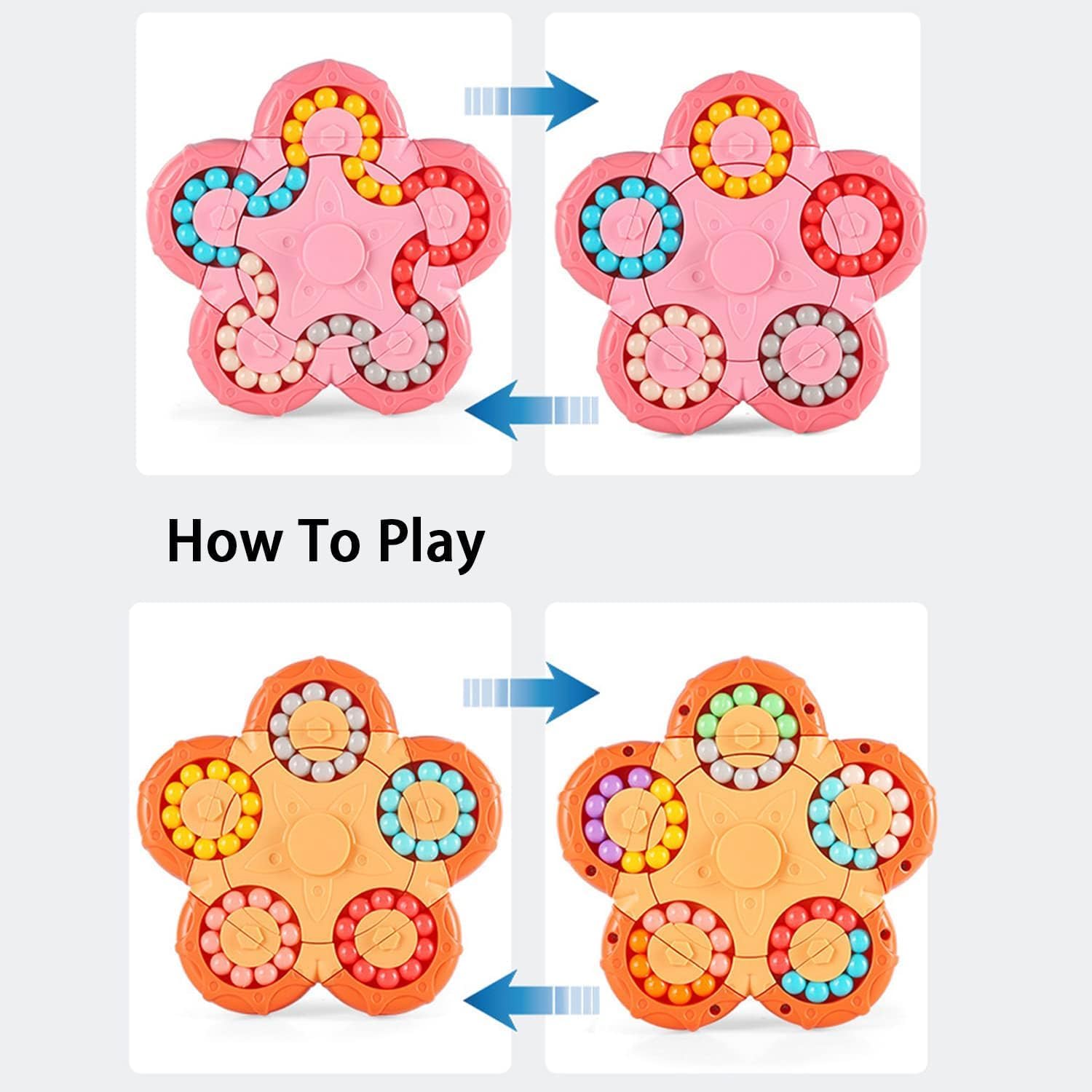 - 【Rotating finger cube toy】 The Magic bean rotating cube toy is double-sided and consists of 6 different colors and 60 magic beans. It is divided into 5 circles, the top and inner of which can be rotated, and each bead is firmly embedded in it, and it is not easy to fall out. Spinning the middle circle can connect 5 circles of beads. You can move the beads freely with both hands and change the beads to different colors. Then make them back to all the same colors as before.