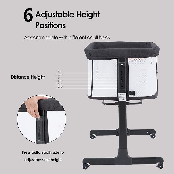 - 【Adjustable Height】Our baby bedside bassinet has 6 different height positions (14.5-18.25inches) to accommodate your adult Beds,Ideal for newborns and breastfeeding moms. Also it has incline mode to prevent your baby from refluxing,making it easy feeding.