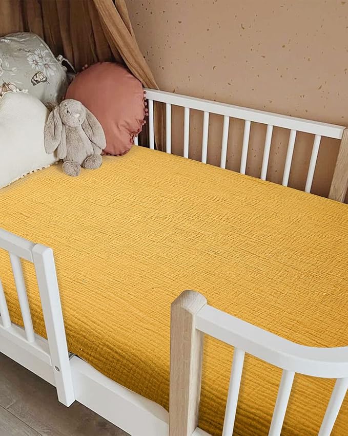 Crib Sheets for Boys Girl, Fitted Baby Toddler Bed Sheets 28" x 52", Neutral Muslin Cotton Crib Mattress Bedding Soft and Breathable Comfort (Mustard Yellow)