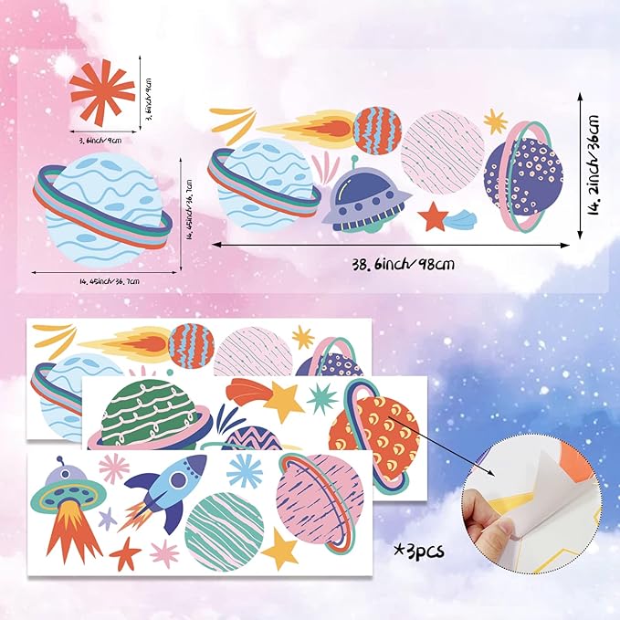 - Creative Outer Space Wall Decals - Include 3 sheet of wall decals, includes 9 planets wall decals and 1 spaceship, 1 rocket and 11 stars in different shapes. and the diameter of the largest planet is 14.5in and the length of the rocket is 13.1in. The planets sticker wall decor makes your kids room more attractive and charming, and your kids will love the space room decor.