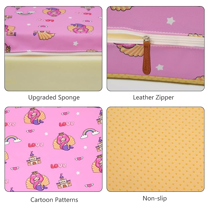 - ATTRACTIVE PATTERN: This toddler booster seat for dining table adopts an interesting animal pattern. The pink mermaid patterns are able to attract children's eyes, let them quickly like the booster cushion that can help them increase their height. The size of the booster cushion are 12.6 x 14.2 x 3.5 inches, which is suitable for most dining chairs.