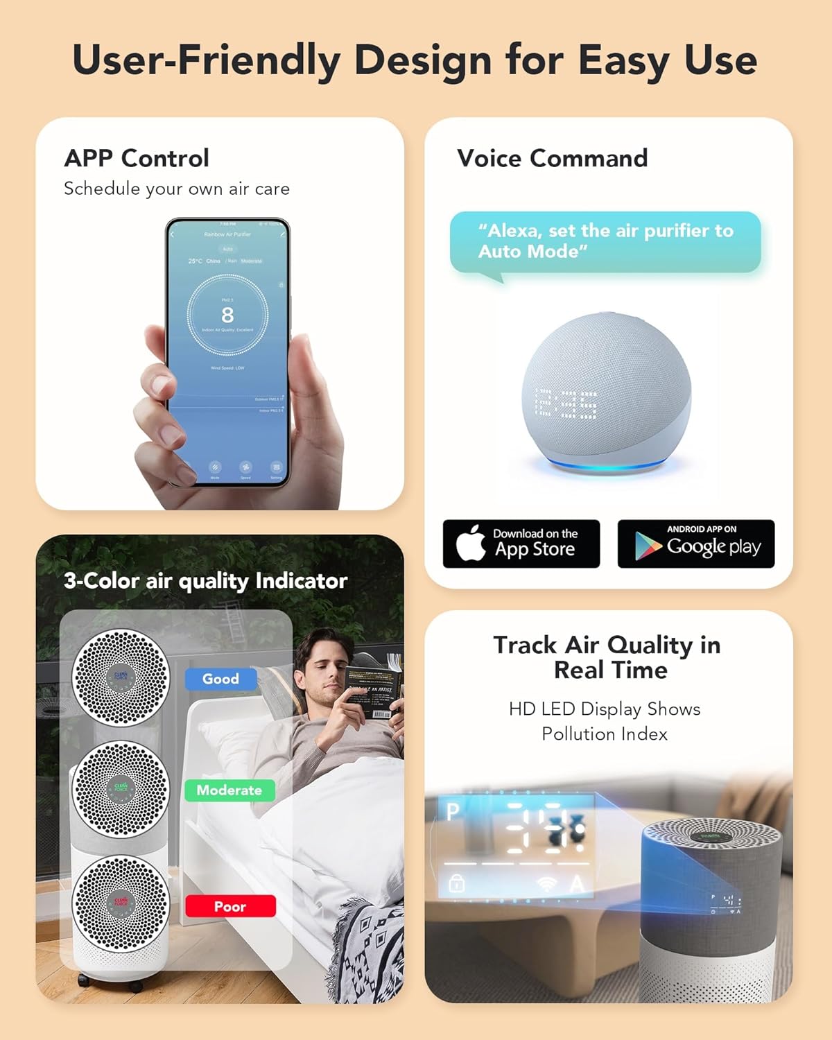 - HIGH-TECH CONTROL: Easy operation with app remote and voice control. Features a 12-hour timer, three fan speeds, and filter replacement reminders, while the HD LED display monitors air quality in real time, making it an ideal choice for home air purifiers