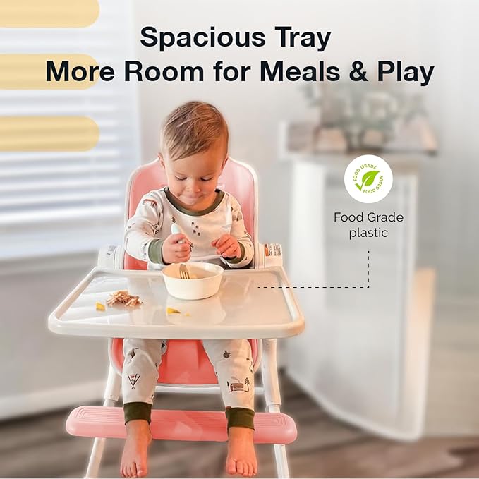 - EASY-TO-CLEAN- This high chair is crafted for convenience with its easy-to-clean design. Featuring a seamless EVA seat pad that can be effortlessly wiped down or detached for thorough cleaning, it ensures no crumbs or food bits get trapped. The detachable, dishwasher-safe tray clicks off easily for quick washes or wipes, making it ideal for hassle-free baby-led weaning.