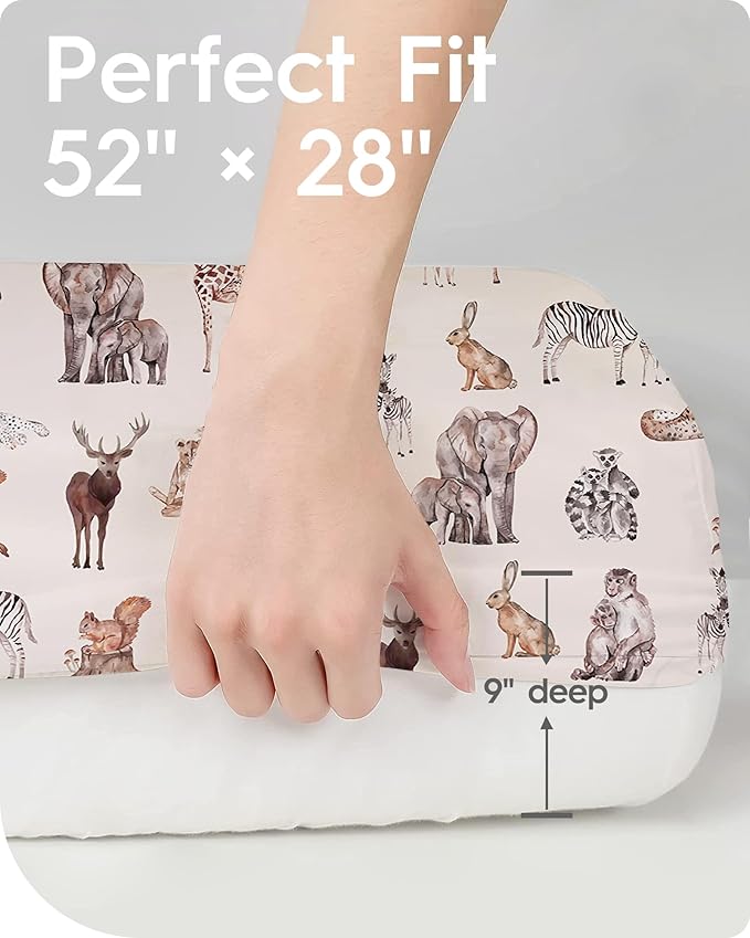 - 360° EFFORTLESSLY FITS: TotBasic fitted crib sheets effortlessly fit standard crib mattresses, measuring 28" x 52", with a flexible depth of up to 9" deep pockets. The premium elastic along the entire bottom edge ensures the sheet cover stays firmly and snugly in place, eliminating worries of it accidentally slipping off over your baby's head.