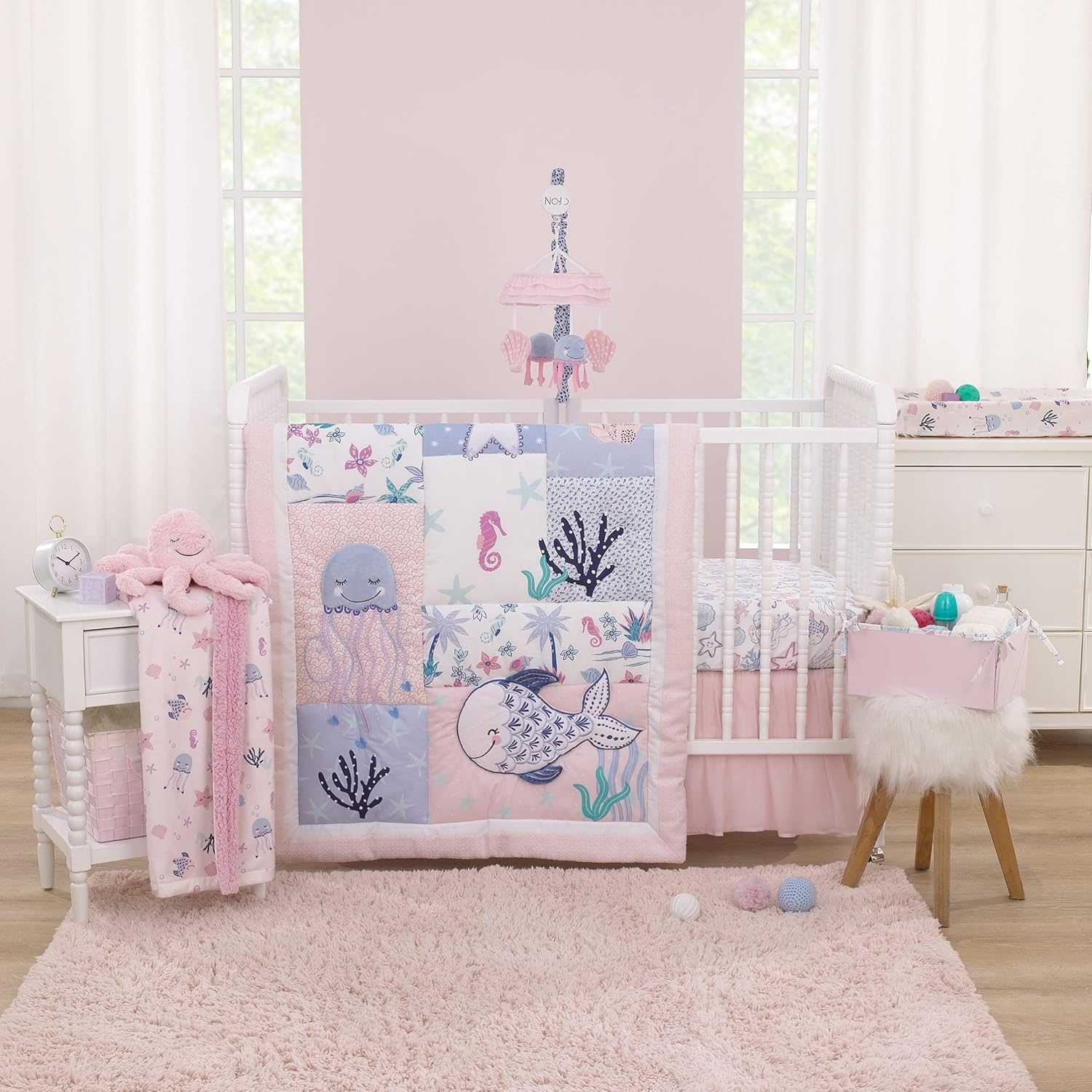 - Features fun sea friends, with jellyfish, and seashells underneath a pink ruffled canopy