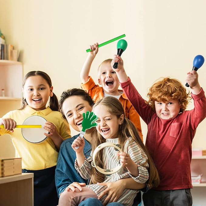 - Percussion Instrument Music Toy Set: the package contains 24 pieces of plastic egg shakers, 24 pieces of plastic sand hammers, 24 pieces of plastic hand clappers, 24 pieces of wooden rhythm sticks, and 24 pieces of plastic finger castanets, 5 styles to bring you a lot of fun, mainly in green, yellow, red and blue, bright and eye catching, easy to attract most boys' and girls' attention, ample quantity can meet your play and replacement needs