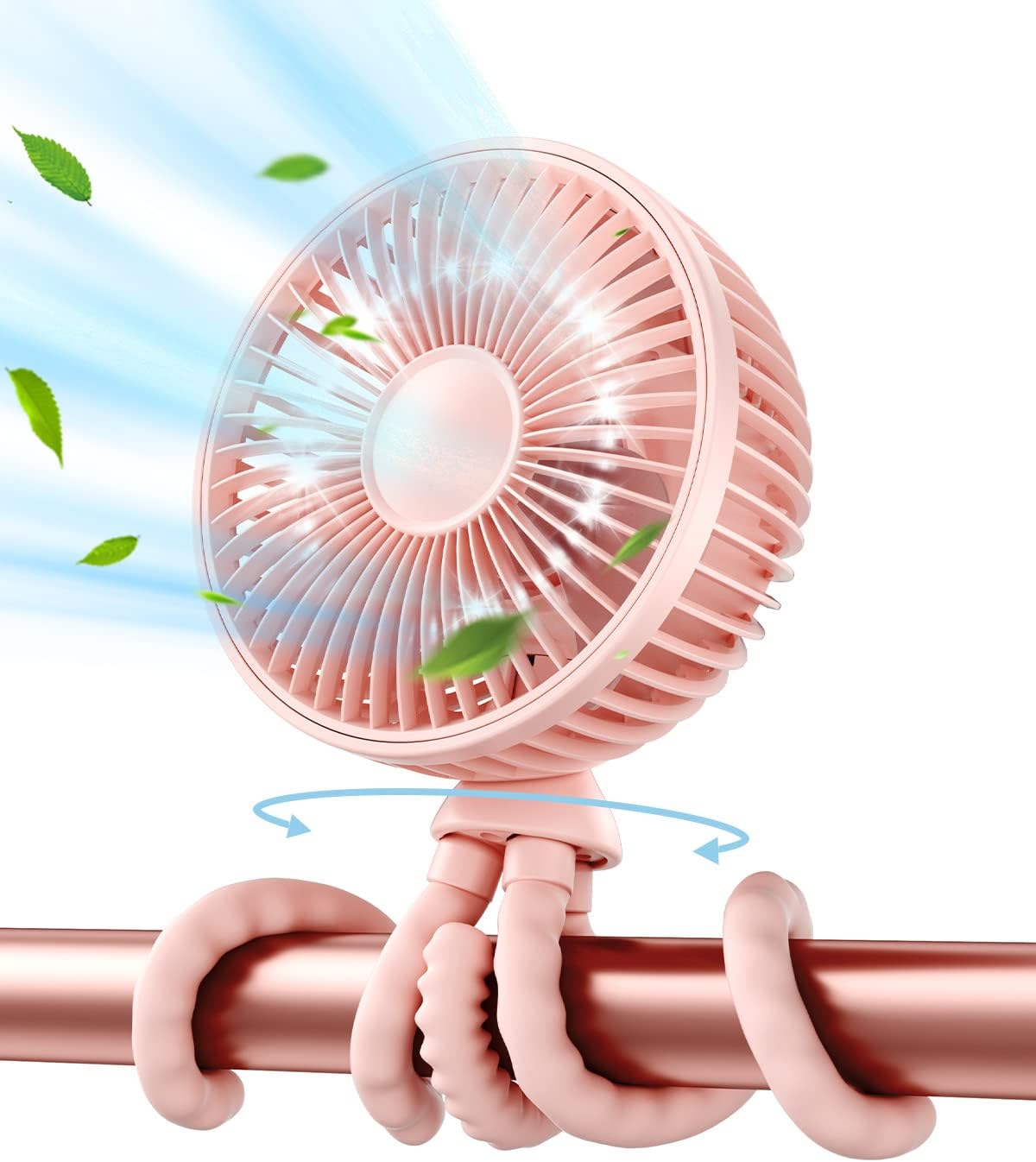 Gaiatop Baby Stroller Fan, 4000mAh Oscillating Mini Portable Fan with Light, 4 Speeds Battery Operated Small Handheld Desk Fan, 360° Rotate Flexible Tripod Clip On Fan for Car Seat Crib Travel Pink