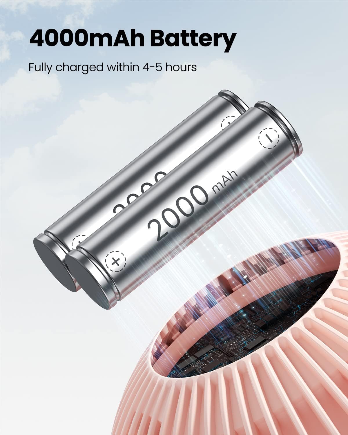 - 4000 mAh Battery and 4.5 H Fast Charging: This portable fan has 4000 mAh large cell capacity; The rechargeable fan lasts 3-12 hours depending on the 4 speeds, and fully charged within 4.5 h; The small fan is charged by a quality USB Type-C port