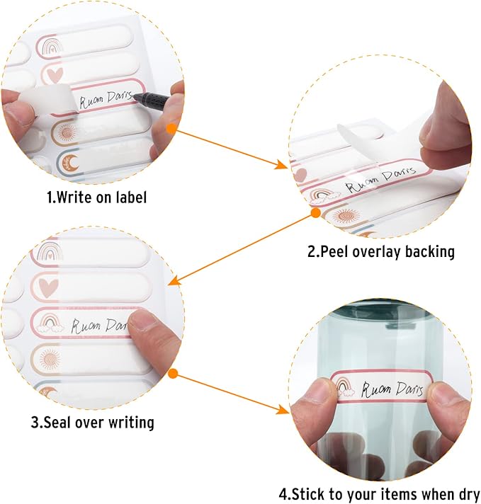 - Multiple Usage----The toddler name stickers can adhere firmly to glass, plastic, paper, metal and wood, perfect name tags for kids stuffs, preschool supplies, daycare essentials, home and kitchen organization, such as plastic water bottles, sippy cups, food containers, lunch box, toys, school gear and more!