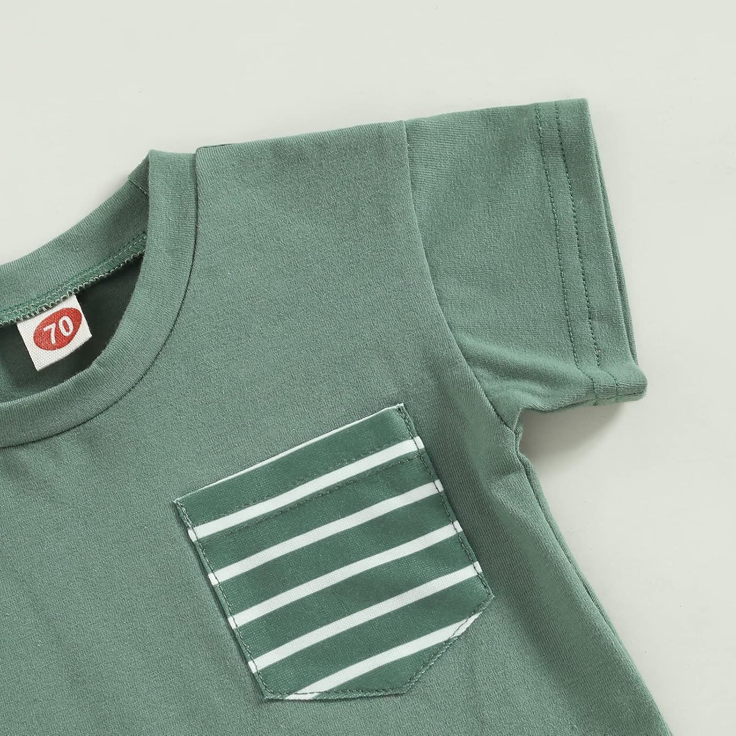 - Relax Crew Neck, One Pocket Front, Striped Pattern, Comfy Short Sleeve T Shirts Tee Tops, Elastic Waist with Drawstring Shorts, Side Pockets, Comfy and Cute Newborn Baby Boys Summer Outfits Clothes, Infant and Toddler Boy Comfy Cotton Shorts Sets