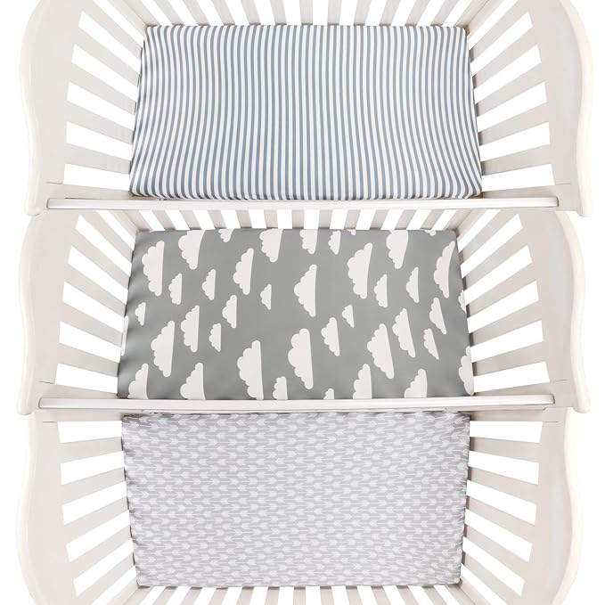Onacosht Pack n Play Sheets 3 Pack for Baby Unisex, Stretchy Jersey Knitted Portable Mini Crib Sheets Playard Mattress Cover for Baby Boys and Girls, Clouds Stripes and Arrow Printing