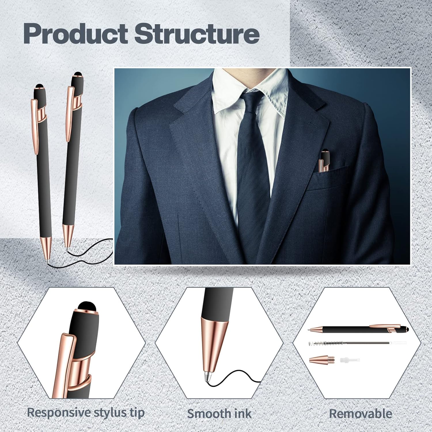- Quality material: penholder is made of high quality metal material, comfortable and durable, press type design makes you don't have to worry about pen cap drops at any time, out the ink flow, not water, the inside of the pen body spring using elastic spring, ensure every press can have induction, let you both write or touch with ease