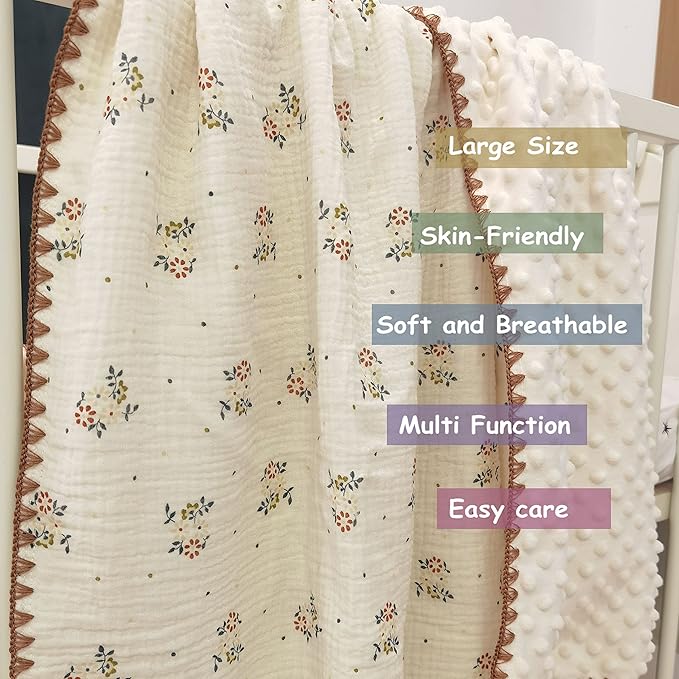 - Soft & Breathable & Comfort: Our baby muslin blanket made from soft cotton muslin fabric and the back side made from 100% polyester, gentle to touch and provides a cozy feeling to your baby, The 3D dots design to holding and cuddling a baby while they are wrapped in a baby soothing blanket can create a sense of closeness and connection.