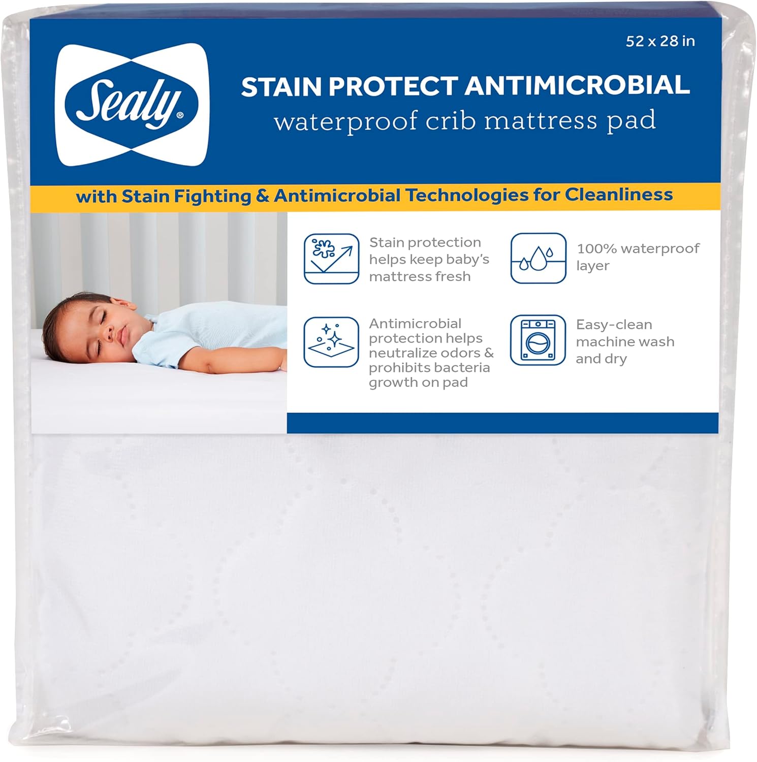 Sealy Baby Stain Protect Antimicrobial Fitted Waterproof Infant Crib Mattress Protector Pad and Toddler Bed Cover, Durable and Comfortable Topper, Machine Washable & Dryer Friendly, 52” x 28”- White