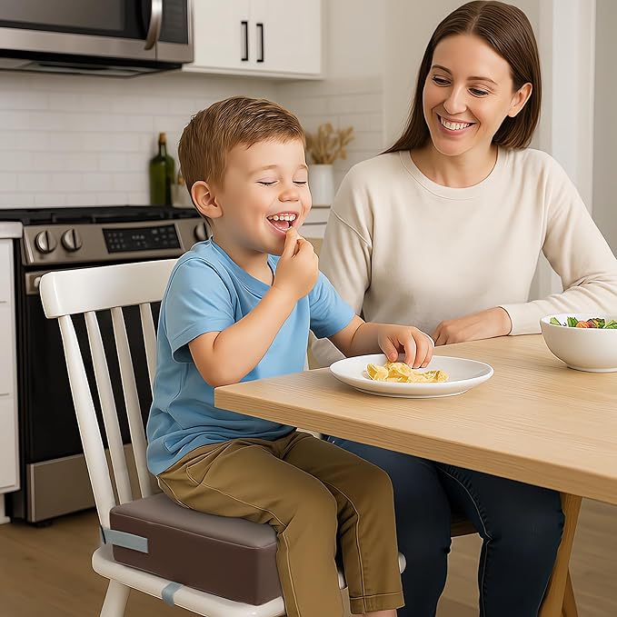 Toddler Booster Seat for Dining Table, Two Elastic Seat Belts, Anti-Scratch PU Skin-Friendly, Waterproof, Anti-Wrinkle, Detachable Non-Slip Bottom - Dark Brown