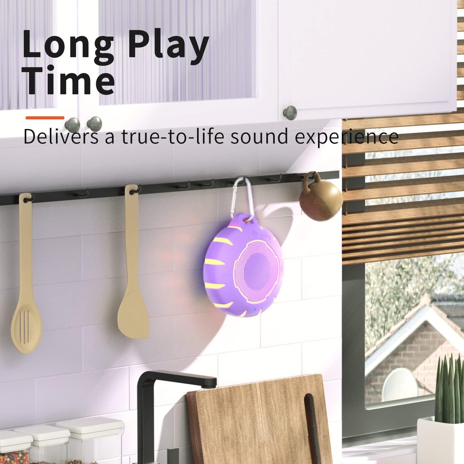 - Portable & Adventure-Friendly: Designed for outdoor fun, this compact speaker includes a carabiner for easy carrying. Perfect for beach outings, kayaking, camping, or poolside relaxation.