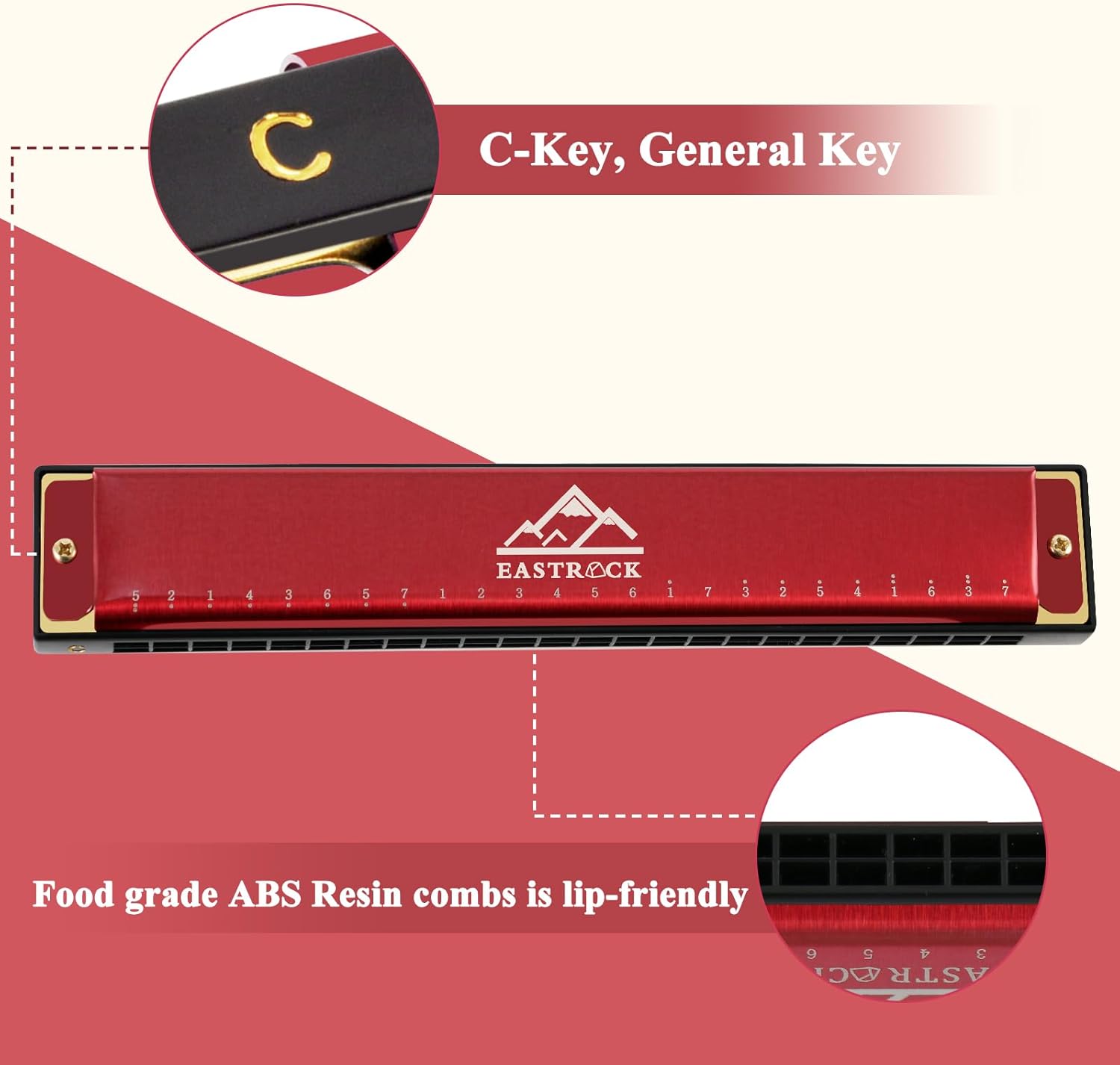 EastRock Blues Harmonica 24 Hole C Key with Case, Mouth Organ Harp, Diatonic Harmonica for Beginner(Red)