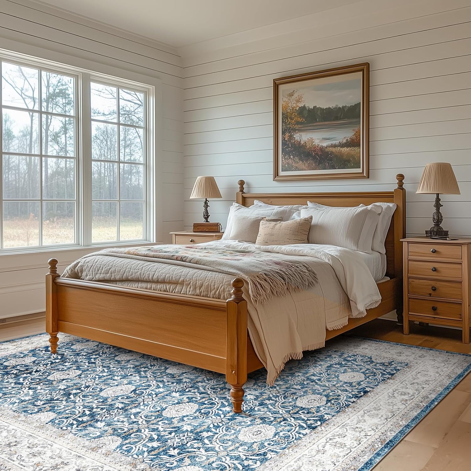 jinchan Floral 6x9 Area Rugs for Living Room - Machine Washable Vintage Distressed Boho Design Throw Rug Stain Resistant Carpet Low-Pile Thin Non-Slip for Bedroom Dining Room Nursery (6‘x9',Dark Blue)