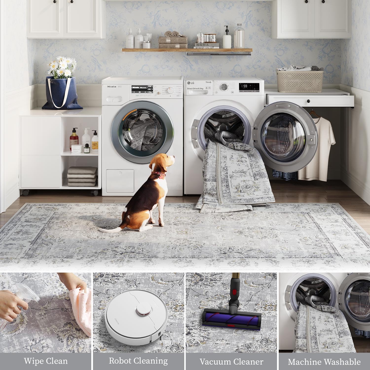 jinchan 9x12 Area Rugs for Living Room - Machine Washable Vintage Floral Distressed Design Stain Resistant Carpet Low Pile Non-Slip Large Rug for Bedroom Dining Room Home Office (9‘x12',Grey)